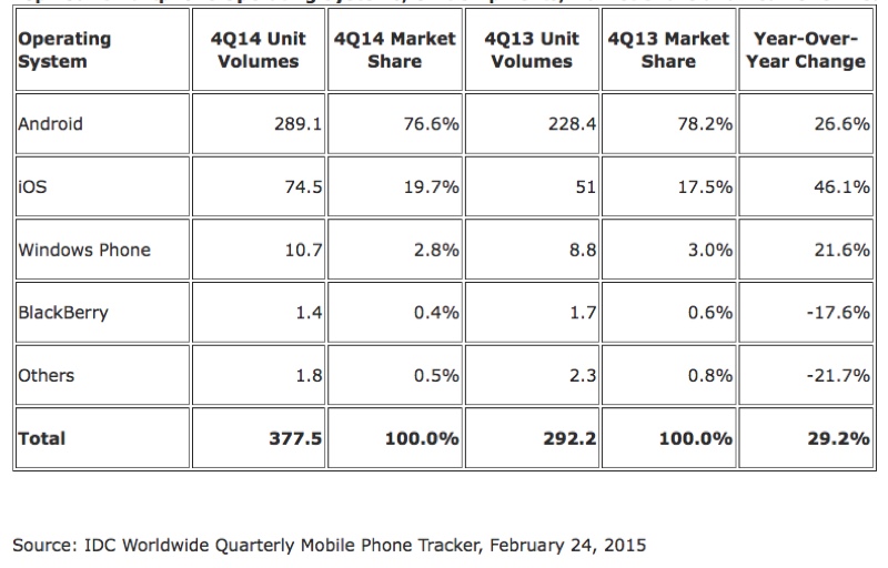 Interessante notare che specialmente nell’ultimo trimestre 2014 iOS cresce più di Android, merito del grande successo dei nuovi iPhone 6. Rispetto ai 51 milioni di dispositivi degli ultimi 3 mesi del 2013, Apple ha incrementato i propri volumi toccando quota 74,5 milioni di terminali, un balzo dei 46,1% e in termini di quote di mercato una crescita del 2,2%. Negli stessi periodi di riferimento Android, seppur i volumi siano sempre in aumento, registra in piccolo calo della propria quota che passa dal 78,2% di fine 2013 al 76,6% negli ultimi tre mesi del 2014, un calo dell’1,6%.