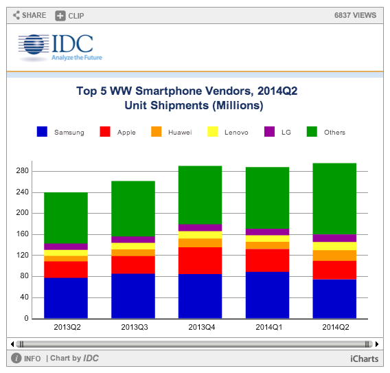 Il mercato smartphone continua a crescere: secondo gli ultimi dati di IDC, il secondo trimestre del 2014 ha segnato un nuovo record in vendite globali, con 295.3 milioni di unità vendute. Fra i primi cinque produttori, sono Huawei e Lenovo, che crescono rispettivamente del 95.1% e del 38.7% rispetto allo stesso periodo dello scorso anno; complessivamente più del mercato smartphone, che ferma la sua crescita al 23.1%.