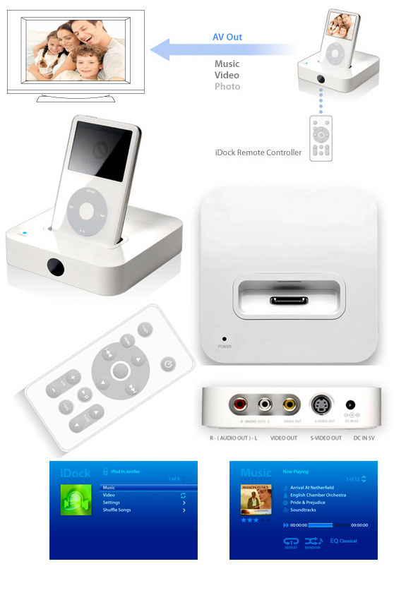 iDock è una docking station per connettere il vostro iPod alla TV. Con iDock, potrete condividere i vostri video, le foto e la musica con chi volete sulla TV.