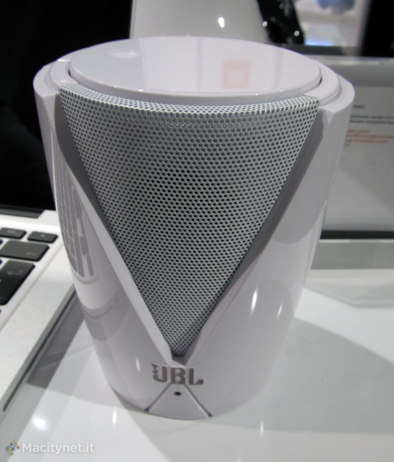 In mostra anche l’economico sistema 2.0 per computer a forma tronco-conica denominato Vibe di cui non ci sono notizie sul sito JBL: a bordo un ingresso ausiliario e una uscita cuffia e sul top di uno dei due speaker un grosso potenziometro rotativo per l’accensione e il volume. E’ destinato probabilmente ad affiancarsi o sostituire le serie Duet mantenendo un prezzo accessibile.