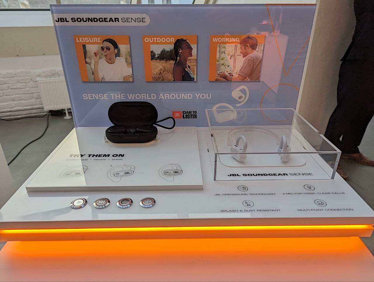 Altra novità sono i JBL Soundgear Sense, i primi auricolari a conduzione d’aria della statunitense di proprietà di Harman International Industries. Tecnologia battezzata JBL OpenSound che sostanzialmente garantisce un ascolto di alta qualità nonostante gli auricolari poggino comodamente sul padiglione auricolare senza ostruire il canale uditivo.