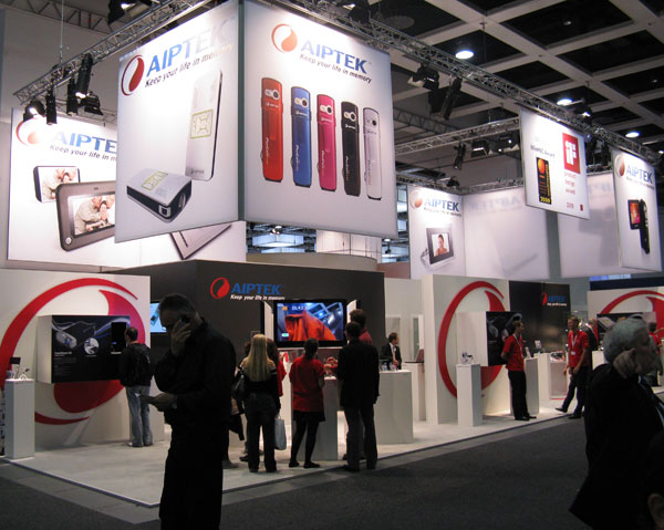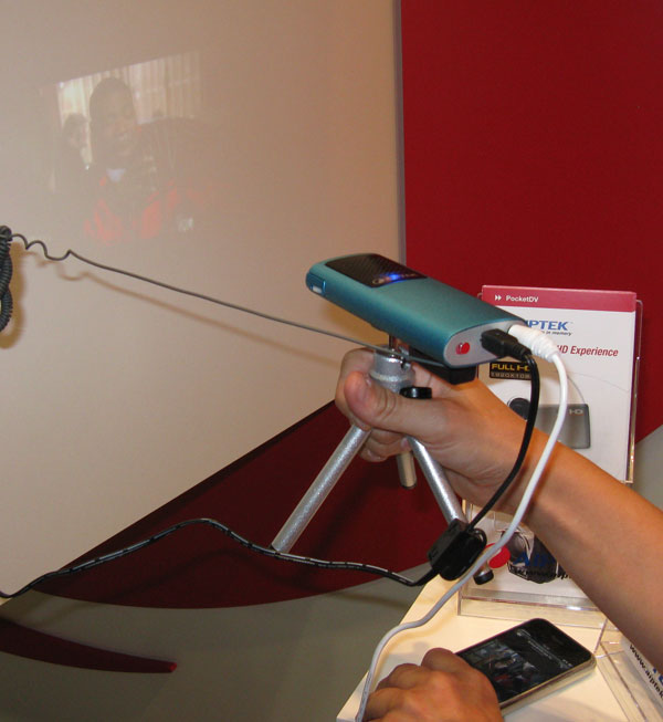 Sempre presso lo stand Aiptek abbiamo poi provato anche il mini proiettore tascabile PocketCinema T30, in sostanza l’evoluzione del primo proiettore miniaturizzato lanciato al CeBit e già pronto per funzionare con iPhone e iPod. Una volta collegato tramite un adattatore Dock opzionale è possibile proiettare fotografie, filmati e anche ascoltare audio e canzoni tramite lo speaker integrato. Proposto al prezzo di 299 euro è in grado di funzionare per 2 ore con la batteria integrata e di proiettare immagini e film fino a 65″. Nella foto è visibile una proiezione in una zona illuminata: il filmato è visibile ma per ottenere risultati migliori occorre utilizzare il mini-proiettore in una zona oscurata.