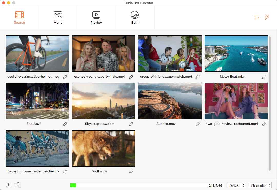 I formati gestiti in input da iFunia DVD Creator sono vari (MP4, MOV, M4V, MKV, AVI, WMV, MTS, M2TS, TS, HD MKV, HD MOV, ecc.), e non devono essere tutti necessariamente dello stesso tipo; è possibile creare DVD partendo da materiale ottenuto da vecchie sorgenti analogiche quali Betamax, VHS tapes, Hi-8mm e telecamere, ma anche videocamere digitali moderne e smartphone, video scaricati da internet, app per creare video, ecc.