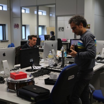 Dalla sala dei “trofei” si passa direttamente all’area di sviluppo e registrazione ancora collocata nella vecchia palazzina negli spazi liberati dopo lo spostamento di metà 2015: qui troviamo decine di ingegneri e tecnici che da una parte studiano i nuovi software e i nuovi prodotti e dal’altra quelli che si preoccupano di campionare strumenti, ricreare sinth virtuali, insomma di creare la “biada digitale” per far lavorare al meglio i cavalli di razza della produzione software.