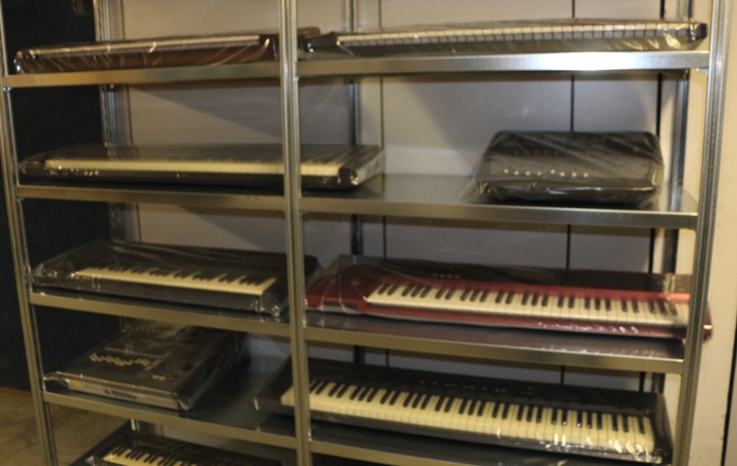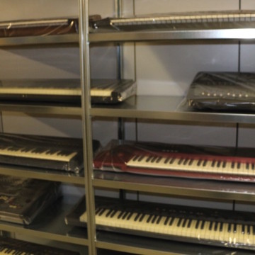 Fabrizio ci porta verso il fianco della palazzina e ci fa attraversare un’area piena di strumenti proprio davanti alla camera insonorizzata dove vengono effettuate le registrazioni dei suoni che andranno a far parte delle librerie di IK… si lavora di continuo per aggiugere strumenti nuovi e d’epoca, adatti per la musica elettronica ma anche per un apporto “etnico” alle musiche dei clienti.