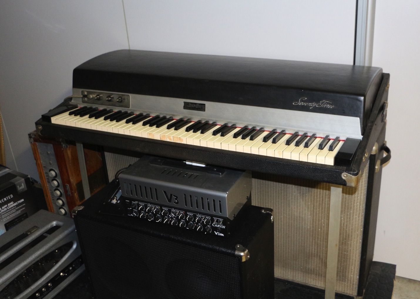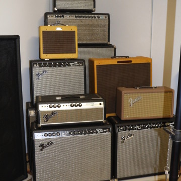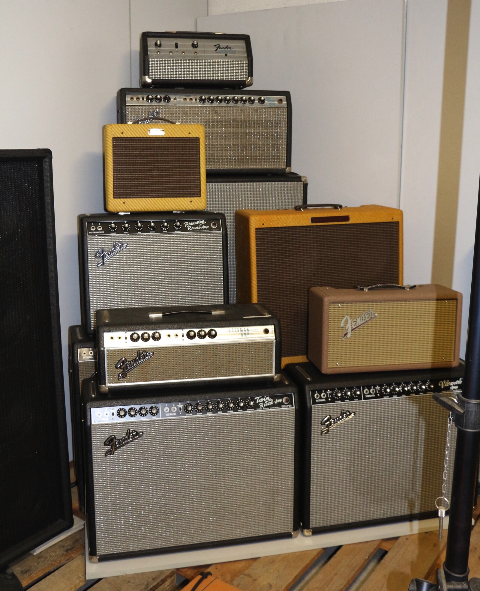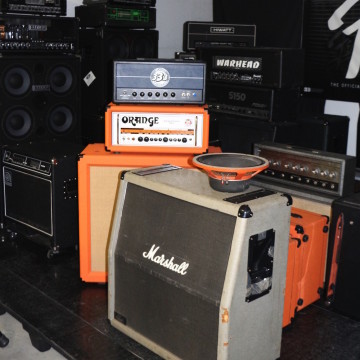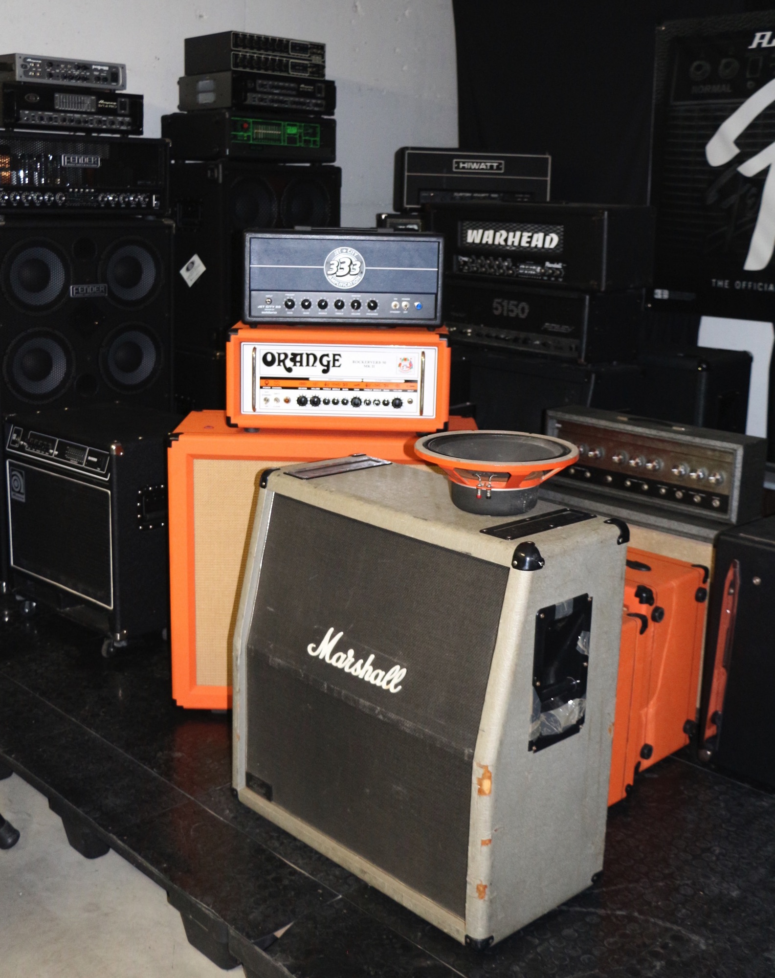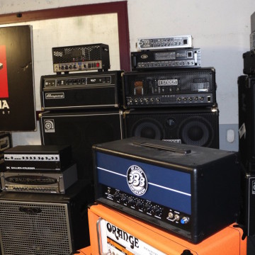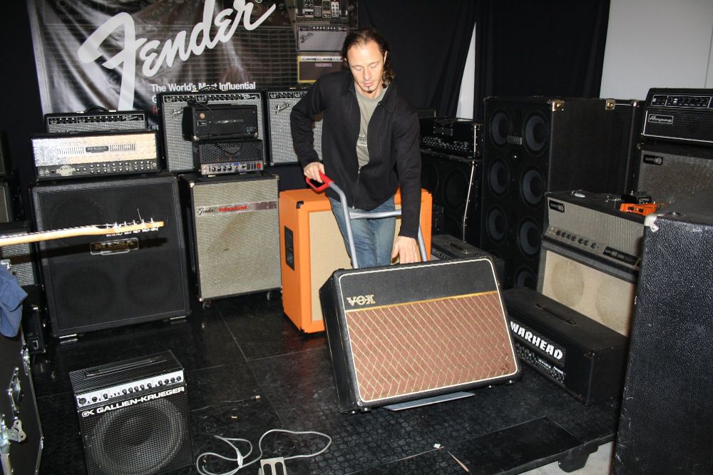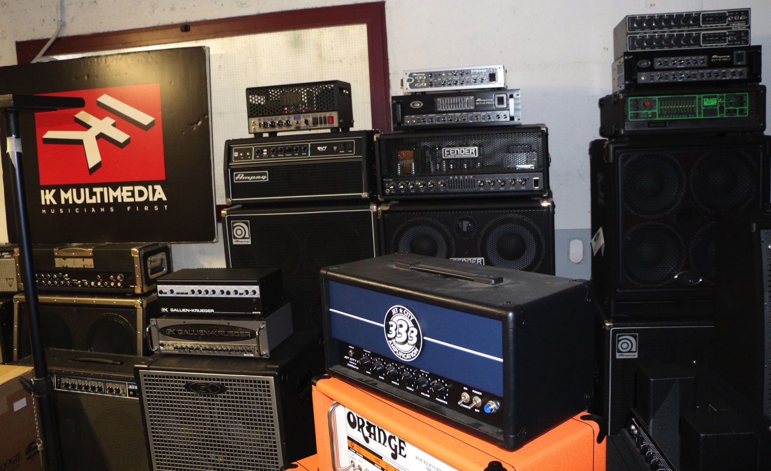 …la “sala del tesoro” è nei sotterranei della palazzina: custodito da una serie di cancelli e sistemi di sicurezza c’è un enorme garage il cui contenuto farebbe morire di invidia qualunque appassionato di musica della terra: decine di amplificatori di ogni età, epoca e marca dai classici Marshall a coloratissimi Orange, organi Hammond e farfisa, strumenti di ogni foggia o genere utilizzati in questi anni per la campionatura sia di suoni che di effetti sono stati comprati ad aste, su eBay o da appassionati per poter essere immortalati all’interno dei software di IK… sono li’ davanti a noi nella loro pura essenza analogica (o se vogliamo pre-digitale), possiamo ammirarli e accarezzarli in una sorta di ri-cognizione della storia della musica degli ultimi 60 anni.