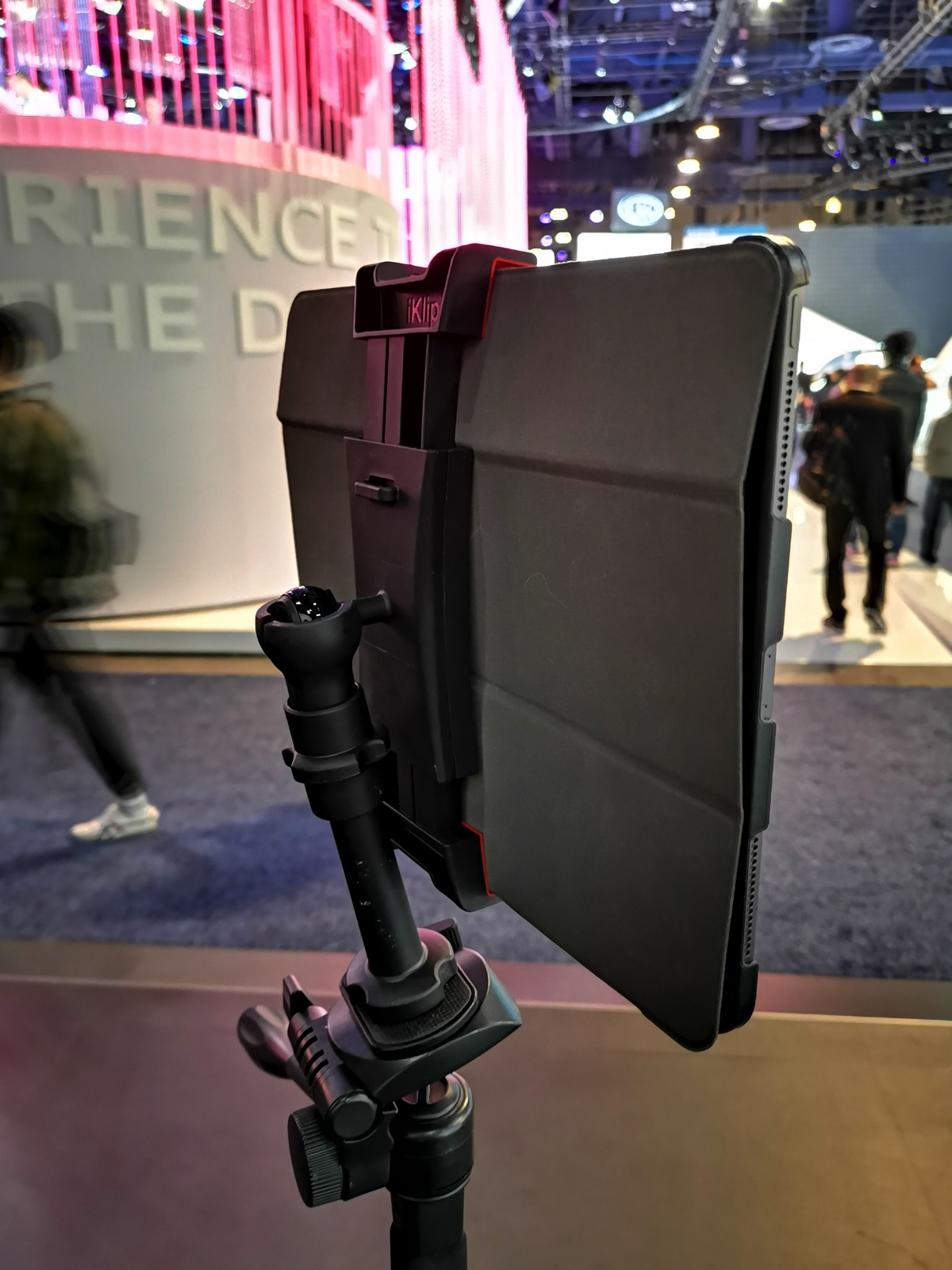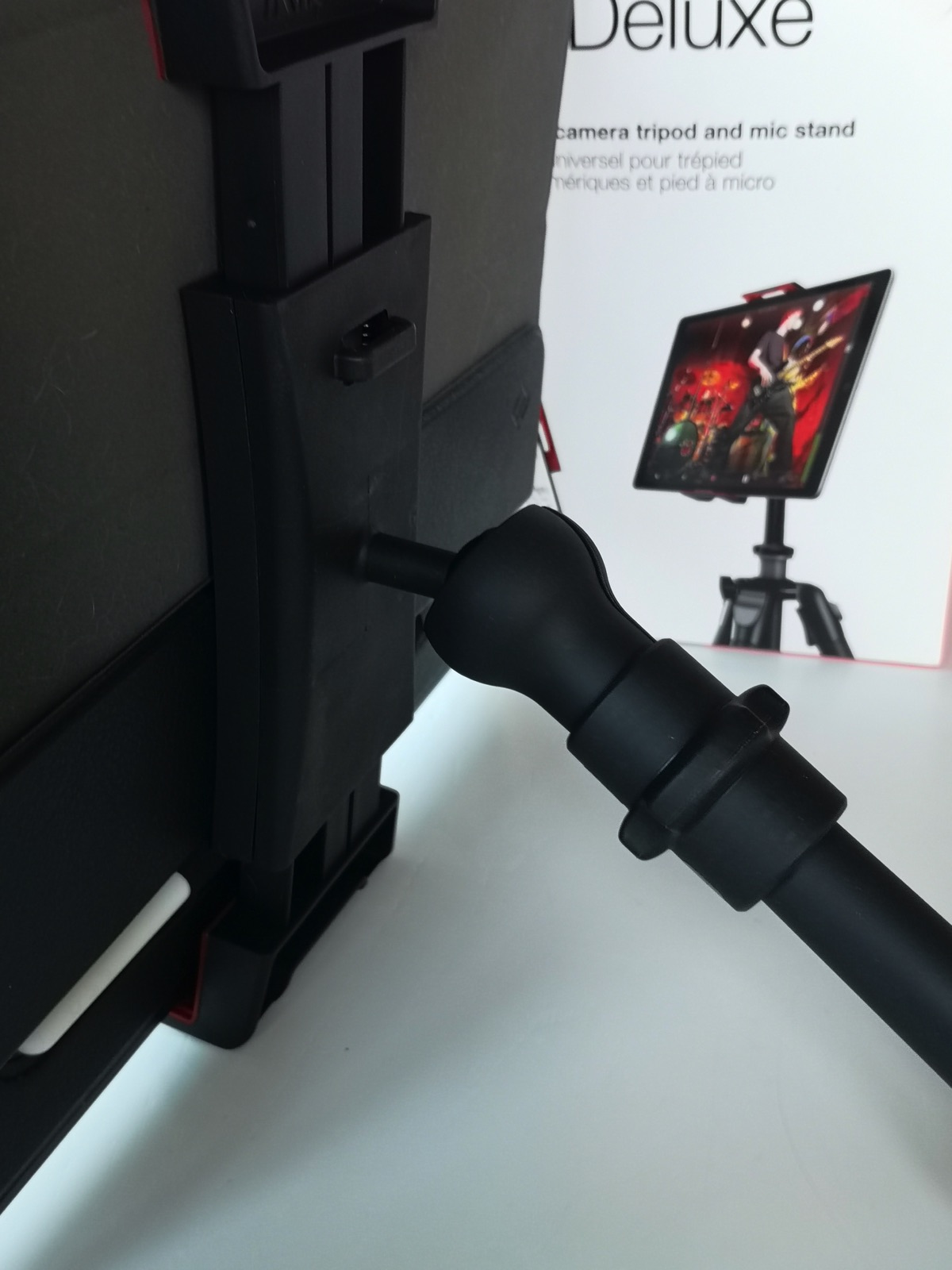 e qui sotto ancora una installazione l’adattore da treppiede per trasformare iPad in un sistema per riprese standup magari abbinato ai microfoni di IK Multimedia stessa. Come si può notare iPad Pro è stato montato senza problemi anche con una spessa custodia.
