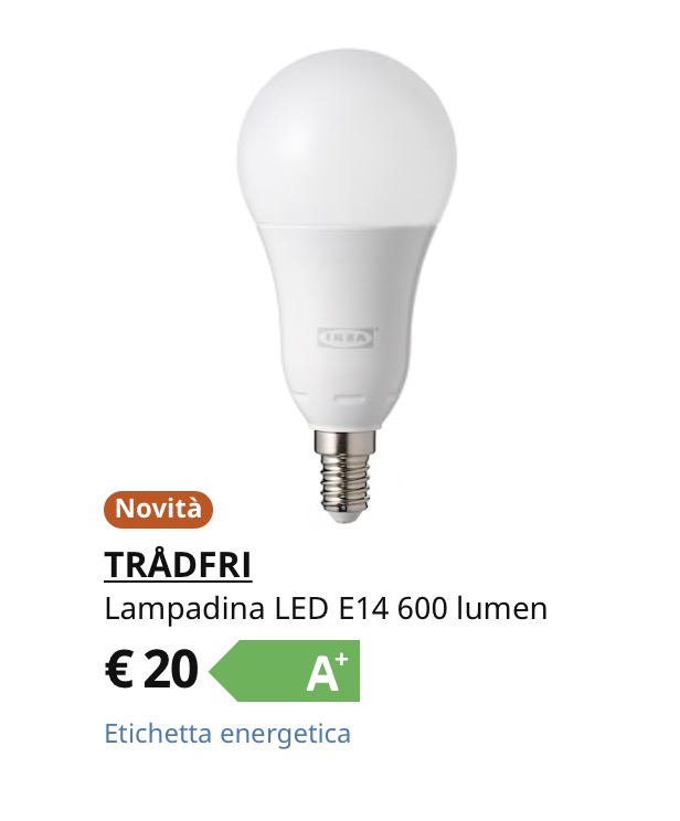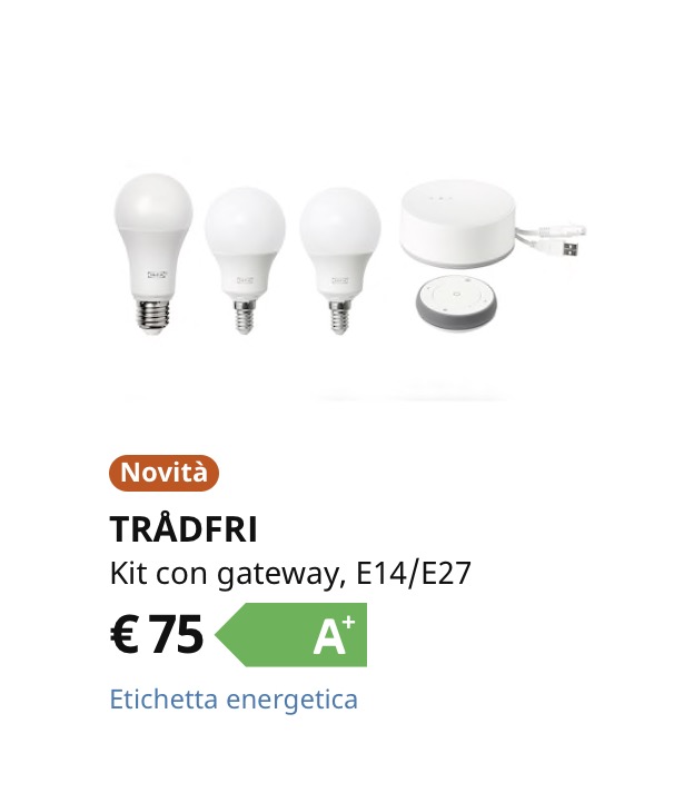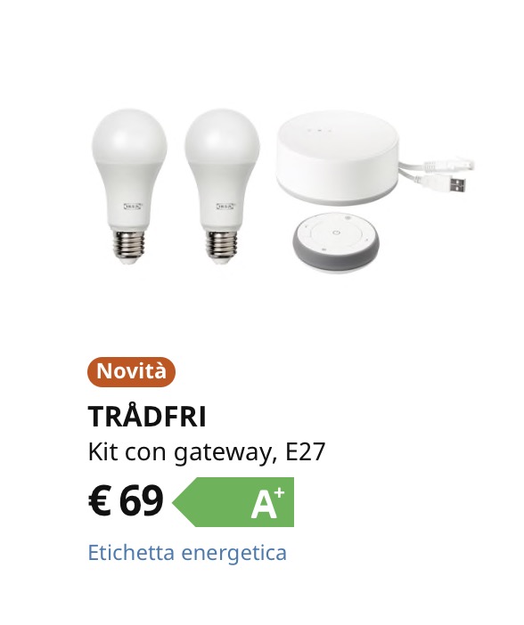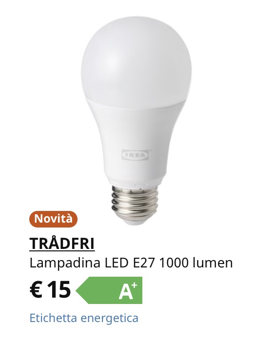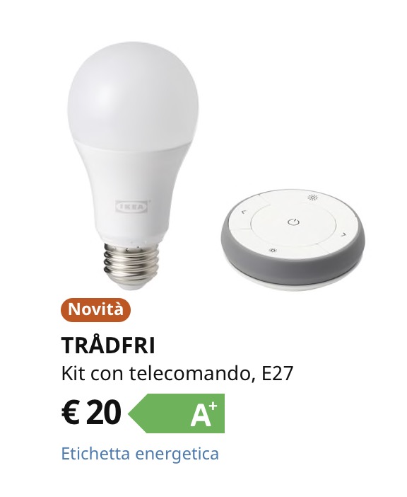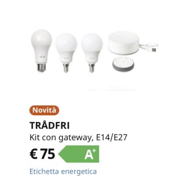 La stessa è proposta anche in kit con le altre due lampadine TRÅDFRI E27, gateway e telecomando al prezzo di 75 euro.