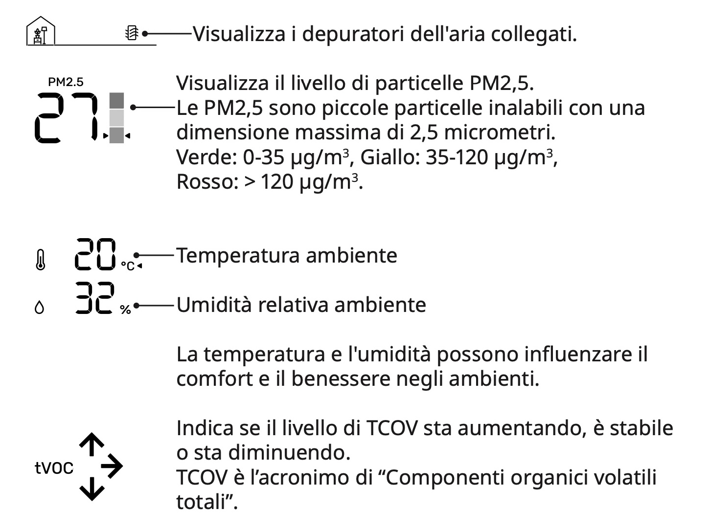 Una volta collegato ad un alimentatore Vindstyrka sarà in grado di funzionare da solo indicando la percentuale di PM2.5, la temperatura (in gradi centigradi o Farenheit) l’umidità in percentuale e l’andamento dei voc nella stanza.