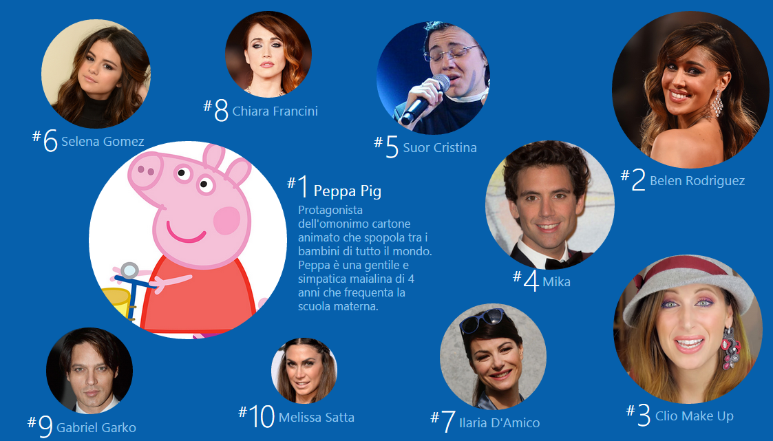 Sta per chiudersi il 2014 e il motore di ricerca Bing ha già fatto un bilancio dei termini più ricercati, rilevando tutto quello che ha conquistato quest’anno l’interesse degli italiani. La regina indicussa delle ricerche su Bing è Peppa Pig; il cartone animato britannico quest’anno ruba lo scettro a Belen Rodriguez (secondo posto), la protagonista dei rotocalchi che nel 2013 aveva catalizzato l’attenzione dei curiosi. Chiude il podio Clio Make up, la truccatrice e blogger Clio Zammatteo che ha fatto della sua passione un vero e proprio business.