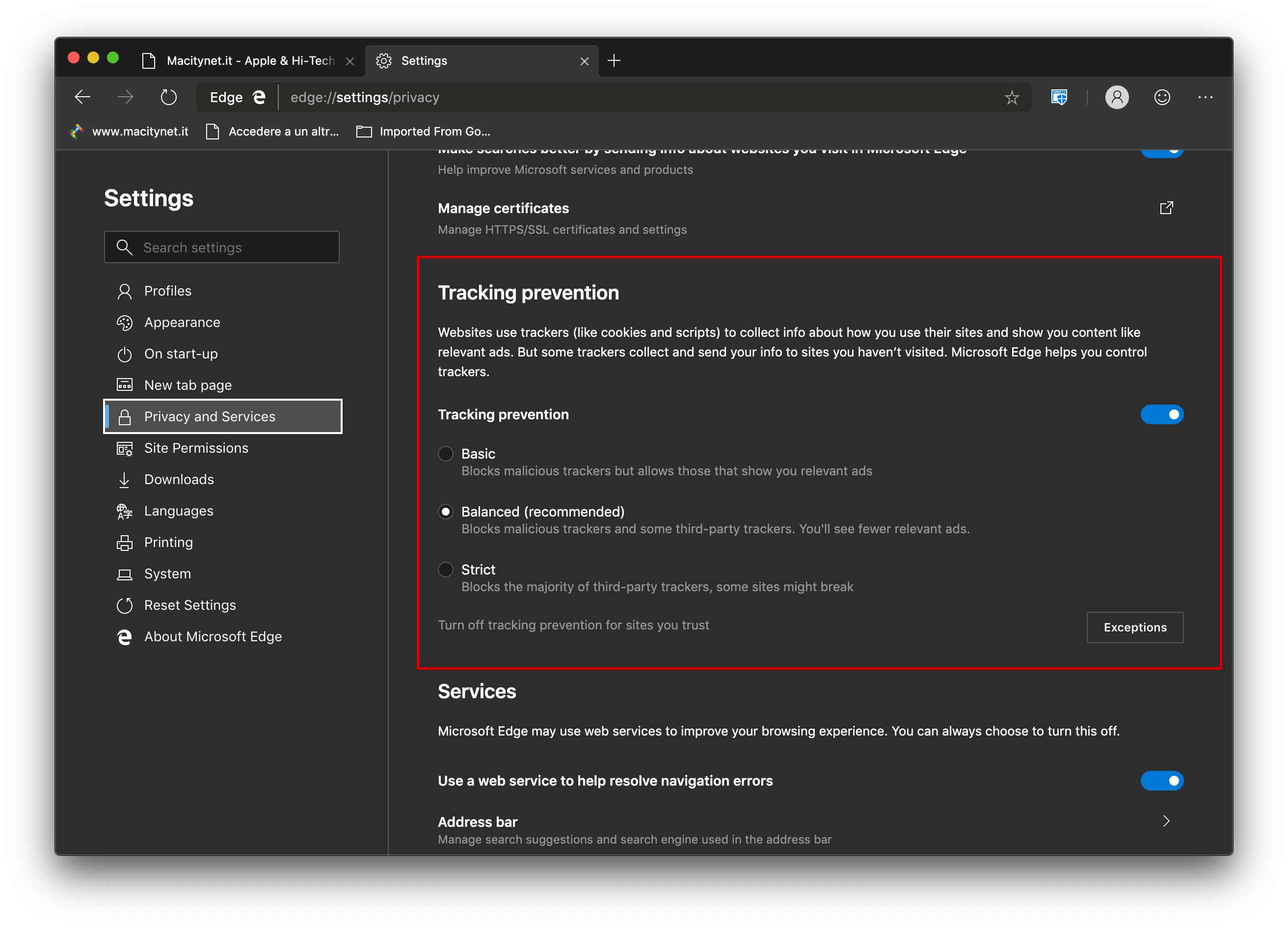 Dopo aver selezionato “enable” e riavviato il browser, è possibile aprire le Preferenze dell’applicazione e, nella sezione “Privacy e Services”, dalla sottosezione “Tracking prevention”, selezionare tre modalità anti-tracking: “Basic” (Blocca solo elementi traccianti conosciuti in finestre anonime), “Balanced” (una modalità bilanciata, quella proposta per default) e “Strict” (blocca tutti gli elementi traccianti rilevati). Tenete presente che, con questa funzione attiva, alcuni siti potrebbero non funzionare correttamente.