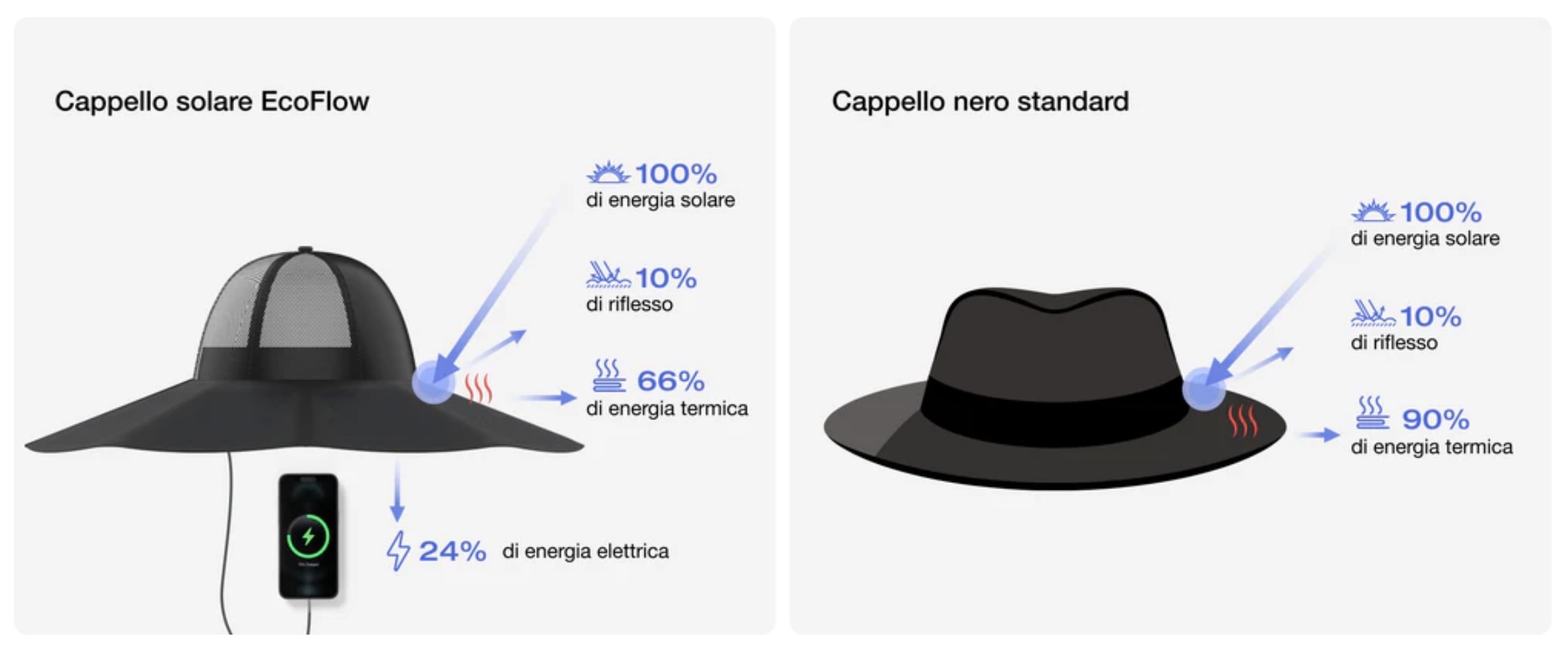 Sarà disponibile da fine Ottobre anche se in quei giorni se la sua efficienza non sarà al massimo EcoFlow Cappello Solare nelle sue due versioni (L-XL) che permette di sfruttare l’energia Solare a 360 Gradi sulla vosta testa.