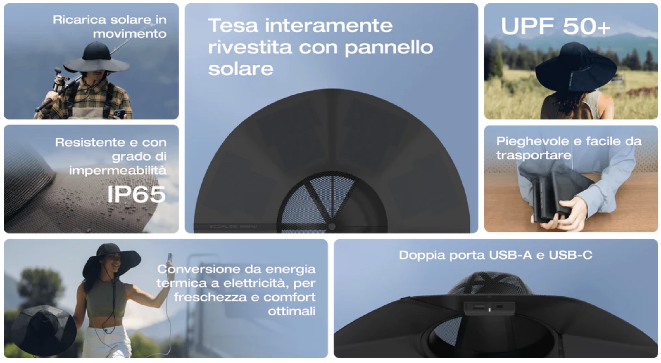 Il cappello impermeabile, ultra leggero (pesa solo 370 grammi) ha a bordo una doppia Porta USB-A e USB-C ed è pensato per chi fa escursionismo, pesca o vuole proteggersi in spiaggia con un livello di penetrazione dei raggi UV testato in laboratorio pari allo 0%, raggiungendo un fattore di protezione dal sole di UPF 50+.