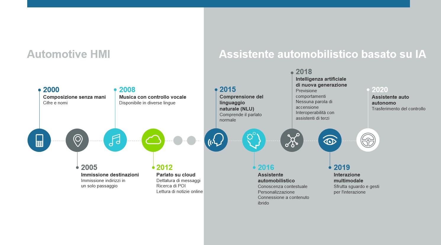 L’introduzione iniziale del parlato in auto offriva funzioni limitate: gli automobilisti potevano soltanto eseguire e controllare semplici funzionalità, cifre e nomi, ad esempio “Chiama 781-545-4721” oppure “Chiama Mario Rossi”. Nel 2012, grazie ai vantaggi del cloud, è stato possibile abilitare le risposte a SMS o email semplicemente dettando il testo da scrivere. Oggi, l’assistente automobilistico comprende realmente a fondo conducenti e passeggeri attraverso la comprensione del linguaggio naturale (NLU, Natural Language Understanding) per rispondere a domande e comandi quali: “Dovrò mettere gli occhiali da sole domani a Riccione?” oppure “Ho fame”. L’intelligenza artificiale (IA) sta spianando la strada agli assistenti automobilistici di nuova generazione, che sono persino in grado di reagire a più richieste, ad esempio: “Blocca lo sportello anteriore e trova un parcheggio vicino al Teatro della Scala che accetti carte di credito e sia ancora aperto dopo il concerto”.