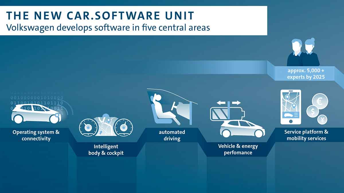 In futuro è prevista una piattaforma software uniforme con tutte le funzioni di base per tutti i veicoli del Gruppo, costituita dal sistema operativo per veicoli “vw.os” e dal Volkswagen Automotive Cloud. Entro il 2025, tutti i nuovi modelli del Gruppo avranno questa piattaforma. La prima vettura basata su di essa sarà la ID.31), in anteprima al Salone di Francoforte di quest’anno.