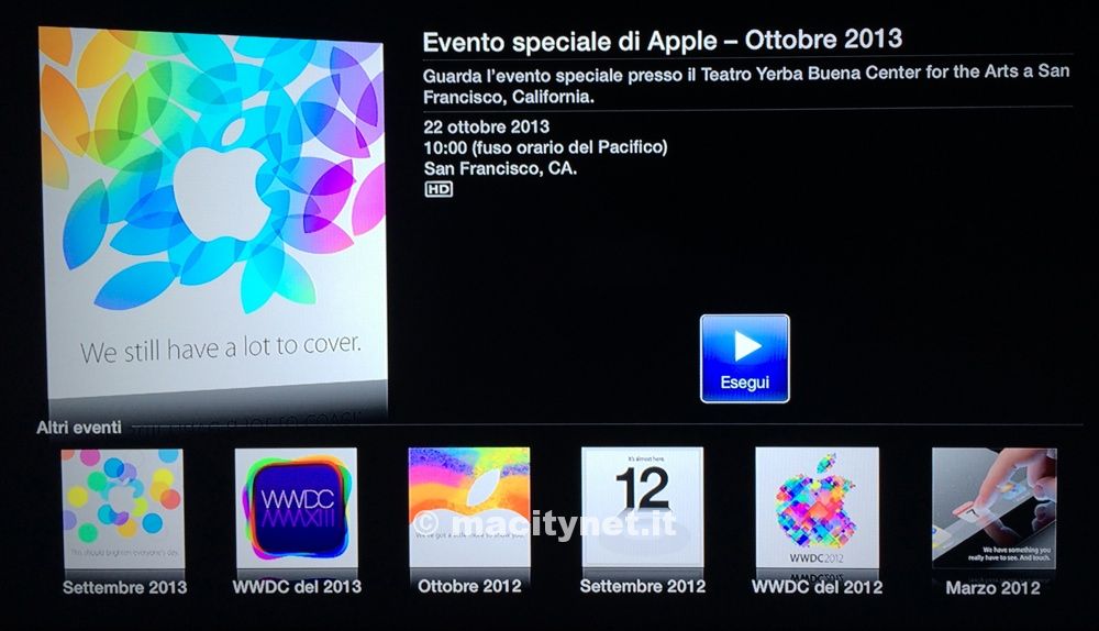 L’evento speciale di Apple di questa sera sarà trasmesso su Apple TV. Nella schermata principale di Apple TV è stato inserito in link al keynote che si svolgerà a partire dalle ore 10 nella costa Ovest degli USA, alle 19 orario italiano. L’icona dell’evento riporta la stessa immagine impiegata da Apple nell’invito spedito a giornalisti e media la settimana scorsa.