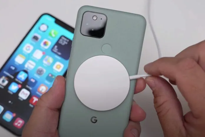 L’aspetto più interessante sembra il fatto che il MagSafe di iPhone sia in grado di allinearsi alla perfezione anche sul retro del Pixel 5 di Google, restando saldamente ancorato allo smartphone Android.