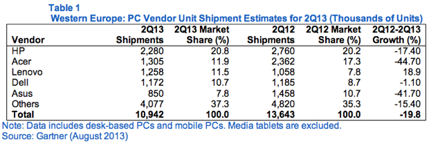 Il mercato PC crolla del 20% e la crisi dei computer prosegue senza lasciar intravvedere una soluzione: è questo quanto emerge dall’ultimo report di Gartner sul secondo trimestre di quest’anno relativo alle spedizioni in Europa Occidentale. In totale sono stati spediti 10,9 milioni di unità, tra desktop e notebook, con un calo del 19,8% rispetto allo stesso periodo del 2012.