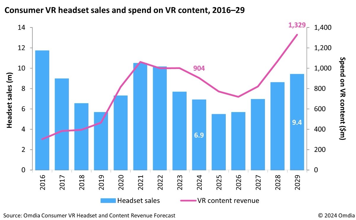 In un report dedicato al settore VR in generale, Omdia riferisce di 904 milioni di dollari spesi nei contenuti VR nel 2024, prevedendo che arriveranno a 1,3 miliardi di dollari nel 2029. Come termine di paragone, la spesa di contenuti per console da gioco ha generato 37,4 miliardi di dollari nel 2024, dato che evidenzia ancora una volta un mercato che è ancora tutto da creare.