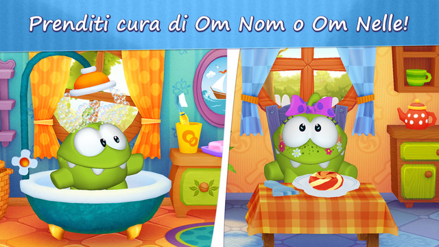 Om Nom, il “coso” (secondo qualcuno è un draghetto, secondo qualcun altro una rana mutata geneticamente, secondo altri solo un piccolo mostro senza identitò), protagonista indiscusso e all’origine di buona parte del successo di Cut The Rope diventa una sorta di tamagotchi. È il nuovo gioco mio Om Nom a permettere di adottare la bestiolina con la faccia da furbastro, ossessivamente a caccia di “bon bon”.