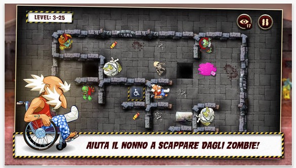 Il Nonno e gli Zombie è un impegnativo puzzle game, con una divertente grafica a fumetto, in cui l’utente dovrà guidare nonno Billy a colpi di touch nei corridoi di un ospedale per fargli evitare gli zombie e al tempo stesso raccogliere caramelle prima di farlo fuggire con l’ascensore.