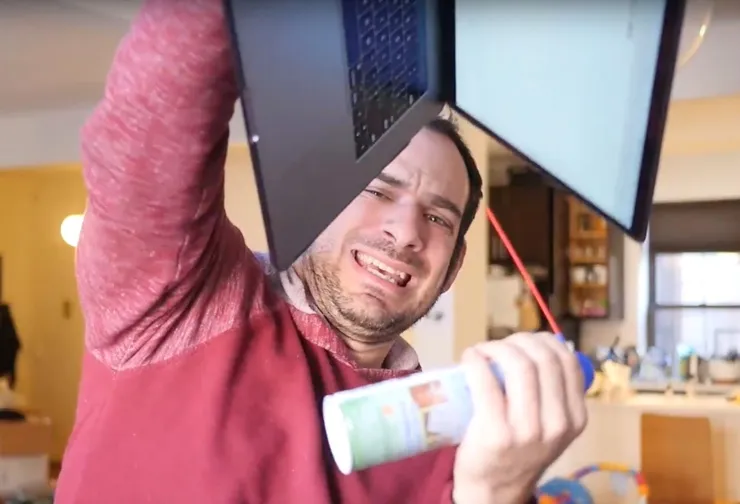 Nel nuovo video Mann è impegnato in una serie di strani movimenti mentre sostiene il suo portatile in alto a varie inclinazioni per sparare meglio un flusso di aria compressa tra i tasti, nella speranza di rimuovere polvere e detriti per recuperare la funzionalità dei tasti bloccati.