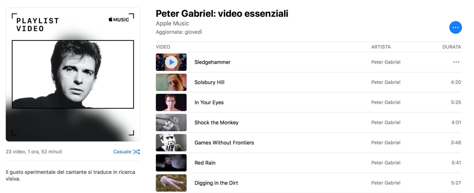 Per vedervi tutto il video dovete essere abbonati ad Apple Music che lo ha inserito una bella playlist di tutti i video di Peter Gabriel. Video che purtroppo non potranno essere tutti rimasterizzati ma che sono sicuramente da vedere e rivedere per la qualità del lavoro svolto dal musicista insieme a tanti registi di enorme talento.