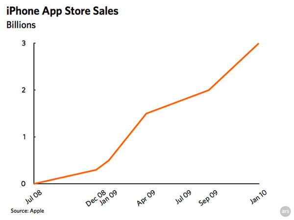 Da luglio 2008, quando l’App store è nato, a oggi, le vendite sono state paurose: 300 milioni di applicazioni vendute al dicembre 2008, 500 milioni all’inizio del 2009, 3 miliardi prima dell’attuale dicembre. Vale a dire 2,5 miliardi di applicazioni scaricate nel solo 2009. Numeri impressionanti. Soprattutto rispetto alla concorrenza, tutta la concorrenza. Che, secondo Gartner nel frattempo ha fatto scaricare circa 16 milioni di applicazioni.