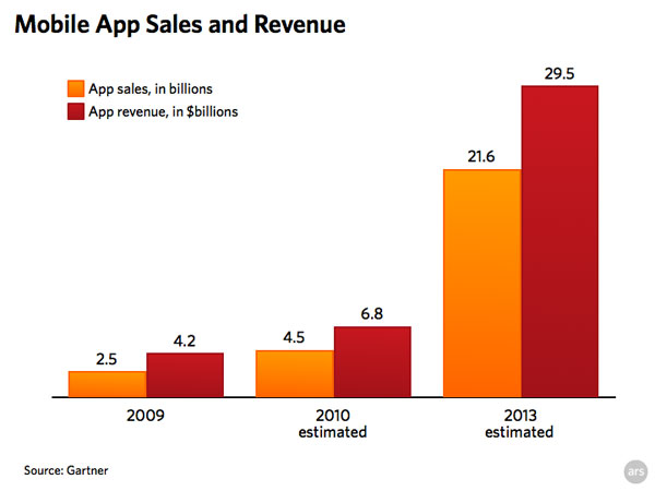 Nel 2010 Apple potrebbe vendere 4,5 miliardi di applicazioni, per un totale di 6,8 miliardi di dollari, e le stime di Gartner arrivano a sostenere che nel 2013 Apple potrebbe vendere 21,6 miliardi di applicazioni con 29,5 miliardi di fatturato.