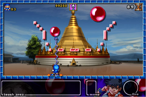 La versione Pang Mobile per iPhone e touc non integra un joypad virtuale bensì una zona precisa dello schermo, lunga e stretta in basso, che permette di scorrere il dito per gli spostamenti a destra e sinistra. Per azionare l’arpione abbiamo invece a disposizione il pulsante di fuoco in basso a destra. Per il resto la nuova edizione di Pang risulta molto fedele all’originale, riproponendo gli schermi con il monte Fuji, la Torre Eiffel, la Statua della Libertà  e altre località  e monumenti tra i più noti al mondo. Si tratta di 17 località  per un totale di 50 livelli di gioco.