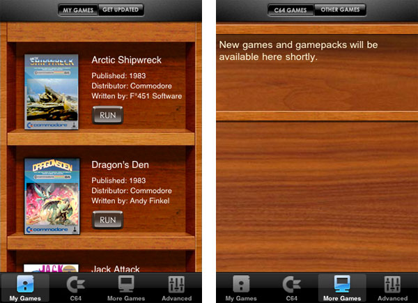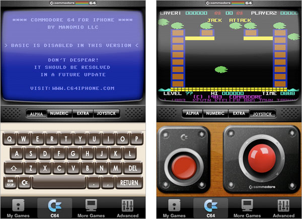 Ora l’emulatore C64 è disponibile su App Store a 3,99 euro: include i giochi Dragons Den, Le Mans, Jupiter Lander, Artci Shipwreck e Jack Attack. I fan storici lamenteranno l’assenza dell’interprete Basic ma gli sviluppatori informano che sarà ripristinato con un aggiornamento futuro. Da una prima prova su strada abbiamo potuto constatare che si tratta di un emulatore ben sviluppato per i tascabili touch della Mela. Oltre a tre tipi di tastiere diverse per caratteri, numeri e simboli speciali, l’utente può scegliere di giocare con lo schermo in verticale diviso in due, oppure in orizzontale. Nel primo caso in alto abbiamo il gioco e in basso joystick e sparo. Basta ruotare iPhone/ touch per passare alla modalità orizzontale dove invece abbiamo a disposizione l’intero schermo per giocare mentre i controlli sono disposti a destra e sinistra: vengono visualizzati solo quando sfiorati con un tap dall’utente.