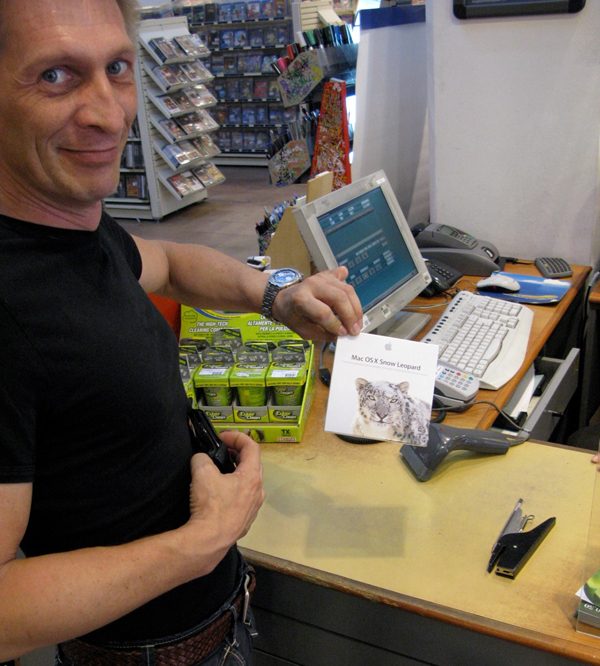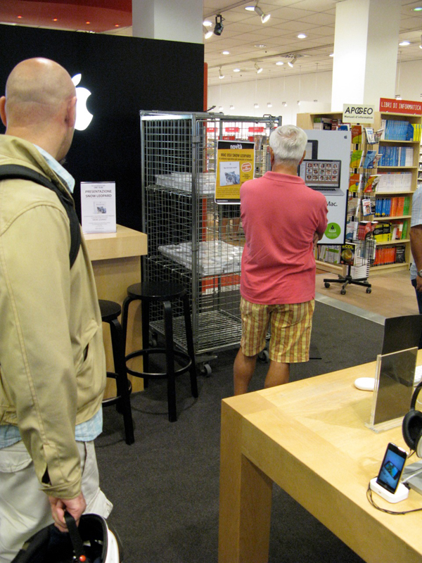 Una generosa quantità di copie del Leopardo delle Nevi ingabbiate e in bella vista tra le corsie del negozio Mondadori di Milano in via Margherza. Questo il curioso spettacolo che possono ammirare oggi i visitatori del Mondadori Multicenter di Milano in una giornata tutta all’insegna della Mela. Il carrello per il trasporto delle confezioni di Snow Leopard è stato predisposto per allestire il punto vendita e posizionare le numerose confezioni in modo ordinato nell’ampia sezione dello store interamente dedicata ai prodotti Apple.