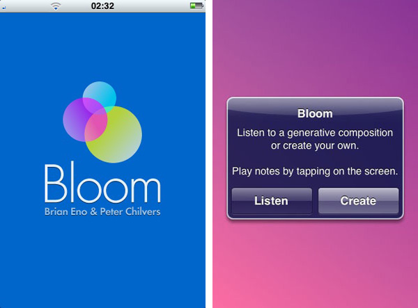 L’applicazione “Bloom”, in vendita da qualche giorno su App Store a 2.99 Euro è sicuramente tra le più interessanti realizzate in questo ambito: invece di trovarsi di fronte una pedissequa riproduzione di uno strumento reale l’utente diventa protagonista di una microinstallazione multimediale e puntando il dito verso lo schermo invia piccoli semi sonori e visuali che si sviluppano e ripetono in un pattern accompagnato da un sottofondo.