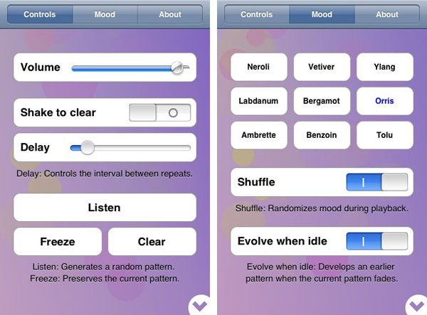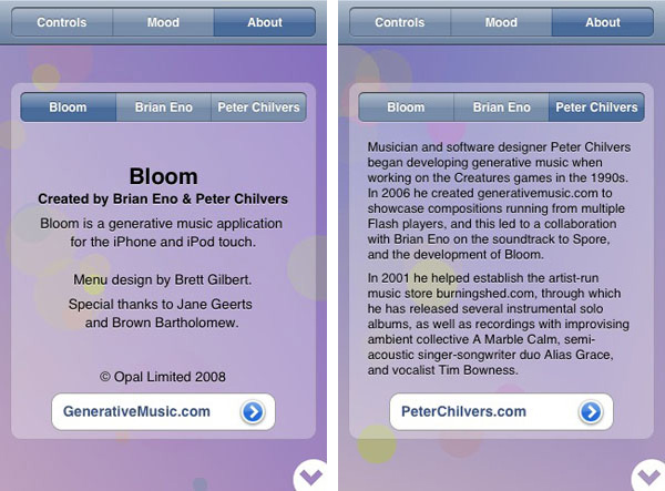 Chi conosce Brian Eno e il suo pluridecennale lavoro sulla musica Ambient realizzato tra opere tradizionali su disco e installazioni artistiche non rimarrà stupito e anzi, si troverà ad essere protagonista da non-musicista di una originale esperienza di interazione tra suono, colore e boccioli virtuali: le varianti dei pattern prendono infatti il nome di essenze quali Bergamotto, Vetiver, Neroli, Tolu.