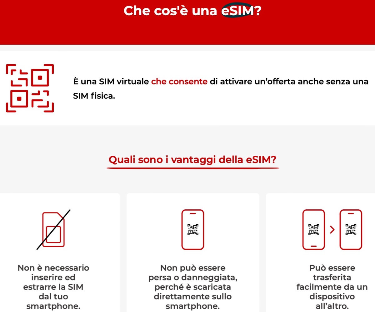 Ricordiamo che l’ eSIM può anche essere trasferita da un dispositivo all’altro, offrendo una maggiore flessibilità agli utenti che cambiano telefono: è sufficiente disinstallarla dal vecchio dispositivo e riutilizzare il QR code, reperibile dalla propria Area Personale o nella mail di sottoscrizione, sul nuovo smartphone.