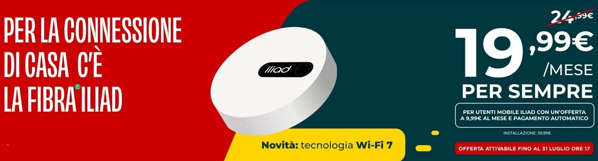 Fino al 31 luglio alle ore 17.00 è possibile sottoscrivere il piano iliad fibra con iliadbox Wi-Fi 7 incluso al prezzo di 19,99 euro al mese, questo per gli utenti già abbonati a iliad mobile con un’offerta da 9,99 euro al mese e pagamento automatico. In tutti gli altri casi il prezzo dell’offerta iliad fibra wi-Fi 7 è di 24,99 euro al mese.