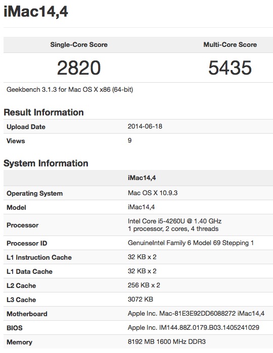 Il nuovo iMac entry level monta un processore a bassissimo voltaggio, l’Intel Core i5 dual-core a 1,4GHz (in Turbo Boost arriva fino a 2,7GHz), lo stesso usato nel MacBook Air e si vede. Almeno se quel che è apparso oggi nei database di Geekbench è un test del nuovo all-in-one.