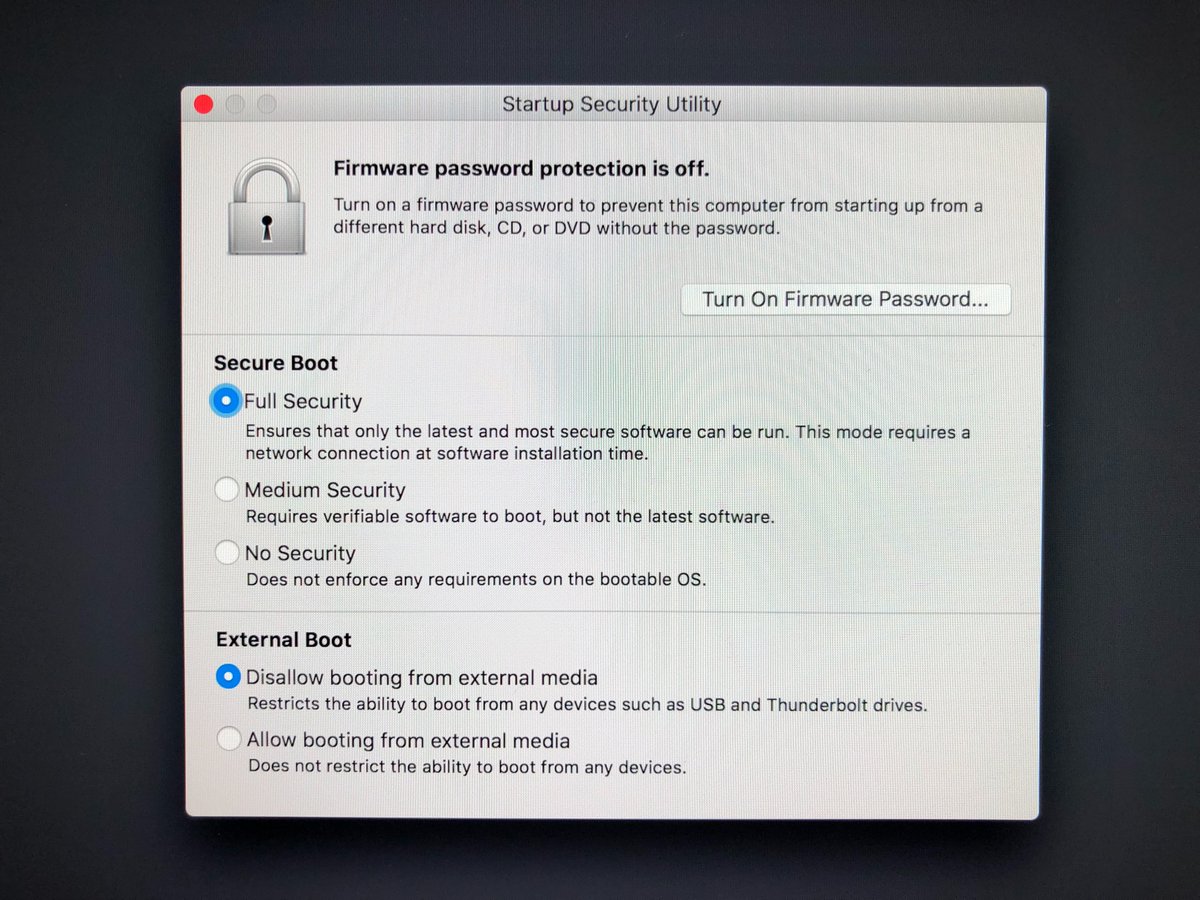 Inoltre, macOS acquisirà anche nuove opzioni “Secure Boot”, che vanno da “Full Security” a “Medium Security”, o nessuna sicurezza. Quando è attivata la sicurezza completa, il sistema garantisce che sia possibile eseguire solo il software più aggiornato e più sicuro, richiedendo una connessione di rete al momento dell’installazione del software.