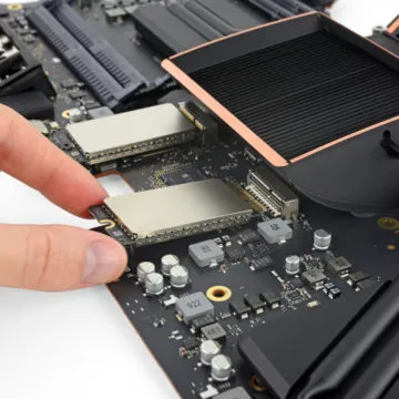 Le unità SSD (due SSD NVMe PCIe in Raid 0) sono marchiate indicate come ” Apple EMC 3197, model 656-0061A” e usano chip SanDisk SDRQF8DC8-128G (quattro per card, due sopra e due sotto, per un totale di 512 GB × 2 = 1024 GB).