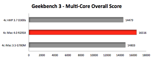 Il nuovo iMac Retina 5K continua a stupire e mostrare i suoi muscoli. Bare Feats ha fatto nuove prove ed eseguito test con Geekbench e altre utility mettendo a confronto: un Mac Pro fine 2013 con Quad-Core Xeon a da 3.7GHz e doppia FirePro D300, un iMac Retina 5K con Quad-core i7 a 4.0GHz e GPU AMD Radeon R9 M295X, un iMac Quad-core i7 a 3.5GHz Quad-Core con GPU GeForce GTX 780M.
