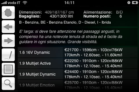 Oltre alle fotografie delle auto e alla scheda tecnica è possibile eseguire ricerche complesse all’interno di tutto il database inserendo marca, modello, cavalli, velocità  massima in KM orari, cavalli, cilindrata e anche prezzo. La descrizione del programma su App Store indica solamente la disponibilità  del software in lingua inglese, in ogni caso nella prima schermata di avvio iMotors permette di scegliere anche l’Italiano e il Tedesco. Tutta l’interfaccia, le informazioni e le schede tecniche, inclusi i moduli per le ricerche e le recensioni sono ben tradotti nella nostra lingua. Ricordiamo che nella finestra delle impostazioni è possibile selezionare l’unità  di misura preferita tra quelle anglosassoni e quelle utilizzate in Italia. Il programma è consigliato senza riserve a tutti gli amanti delle quattro ruote ma anche a chi, per passione o lavoro, desidera sempre disporre di notizie e informazioni sulle auto a portata di mano. L’unico dettaglio a nostro giudizio migliorabile è l’interfaccia e le icone per la navigazione e l’accesso alle varie sezioni del software, non sempre il funzionamento risulta chiaro, richiedendo così un po’ di pratica soprattutto al primo utilizzo.