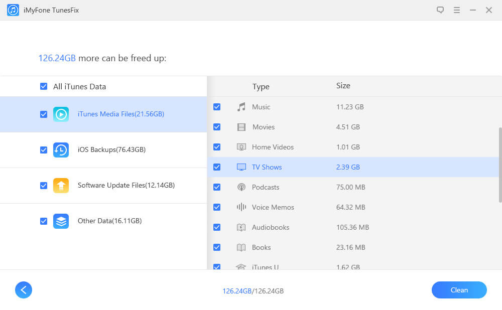 Ancor prima di riparare errori, però, iMyFone TunesFix offre una funzione per liberare spazio nel proprio PC, occupato da dati iTunes, si cui magari si sconosce l’origine. Due sono le tipologie di pulizia offerte all’interno dell’app: la prima più superficiale e veloce, la seconda, invece, più profonda e completa. La prima è comunque sufficiente a rimuovere eventuali aggiornamento iOS e iTunes presenti sulla macchina, che non servono più, ma che spesso occupano facilmente qualche GB di memoria.