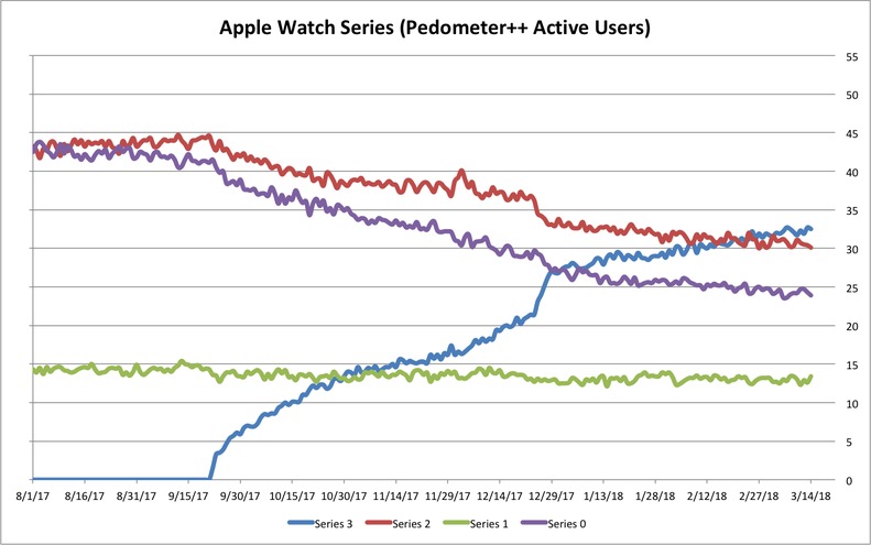 Come sviluppatore, Smith spera che Apple non supporti la prima generazione di Apple Watch con watchOS 5, perché lo sviluppo di app per l’orologio di prima generazione è fastidiosamente lento, e non vale il tempo speso. Per fortuna, la sua ricerca dimostra che l’utilizzo della prima generazione di smartwatch è in costante declino, con meno di 1/4 degli utenti tracciati che utilizzano ancora il primo Apple Watch.