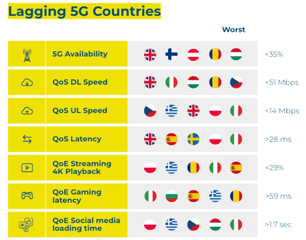 Nel caricamento di video 4K in streaming gli Italiani dispongono di prestazioni 5G inferiori del 29% rispetto alla media UE, mentre la latenza risulta superiore ai 59 millisecondi. Il tasso di interruzione dello streaming è tra i più alti in assoluto, pari al 24%, segno di potenziale instabilità nelle connessioni.