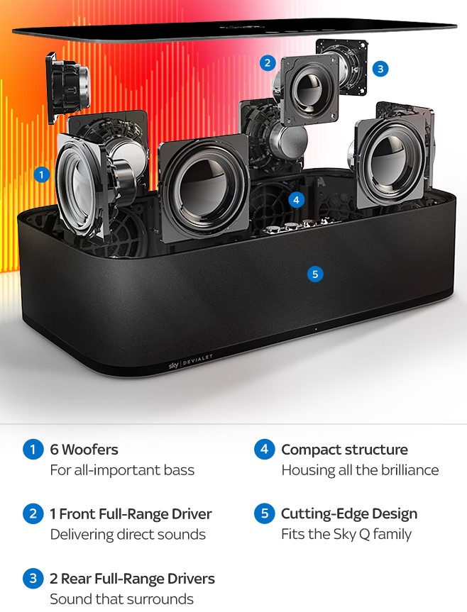 Sky Soundbox è di fatto una Soundbar dalle proporzioni un po’ strane: più alta che larga (solo 38 cm) rispetto alle normali soundbar in commercio si fa forte della presenza di 6 woofer da 7.5 cm (due frontali, due sul retro e due su ogni fianco) e 3 speaker per le medio alte 5 cm per una diffusione del suono che dovrebbe creare un effetto surround virtuale. Grazie alla presenza dei 6 subwoofer e della cassa armonica di buone dimensioni l’estensione verso il basso della gamma raggiunge i 35 Hz. E’ previsto il supporto per Dolby Digital +.