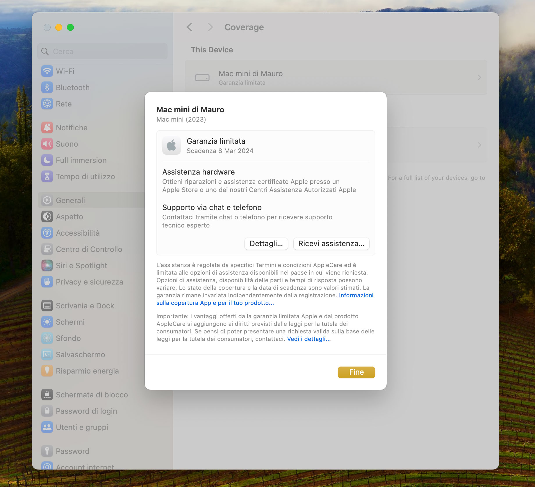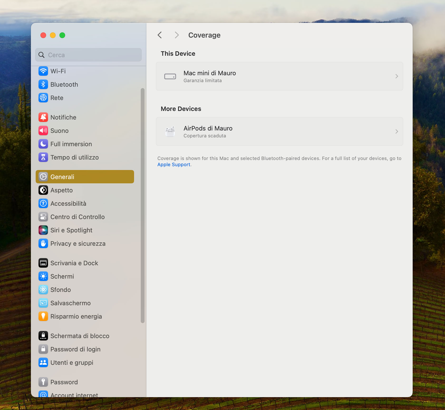 In modo analogo a quanto già possibile su iPad e iPhone andando su Impostazioni > Generali > Info > Copertura, è mostrata una schermata che consente di verificare lo stato di garanzia del computer e di altri accessori Apple associati allo stesso.