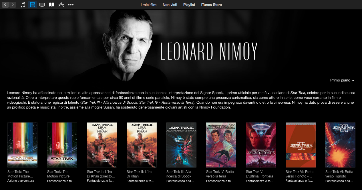 Nell’introduzione alla sezione speciale dedicata all’artista eclettico, gli autori di iTunes spiegano: “Leonard Nimoy ha affascinato noi e milioni di altri appassionati di fantascienza con la sua iconica interpretazione del Signor Spock, il primo ufficiale per metà vulcaniano di Star Trek, celebre per la sua indiscussa razionalità. Oltre a interpretare questo ruolo fondamentale per circa 50 anni di film e serie parallele, Nimoy è stato sempre una presenza carismatica, sia come attore in serie, come voce narrante in film e videogiochi. E’ stato anche regista di talento (Star Trek III – Alla ricerca di Spock, Star Trek IV – Rotta verso la Terra). Quando non era impegnato davanti o dietro la cinepresa, Nimoy ha dato prova di essere anche un prolifico poeta e musicista; inoltre, assieme alla moglie Susan, ha sostenuto generosamente giovani artisti con la Nimoy Foundation”.