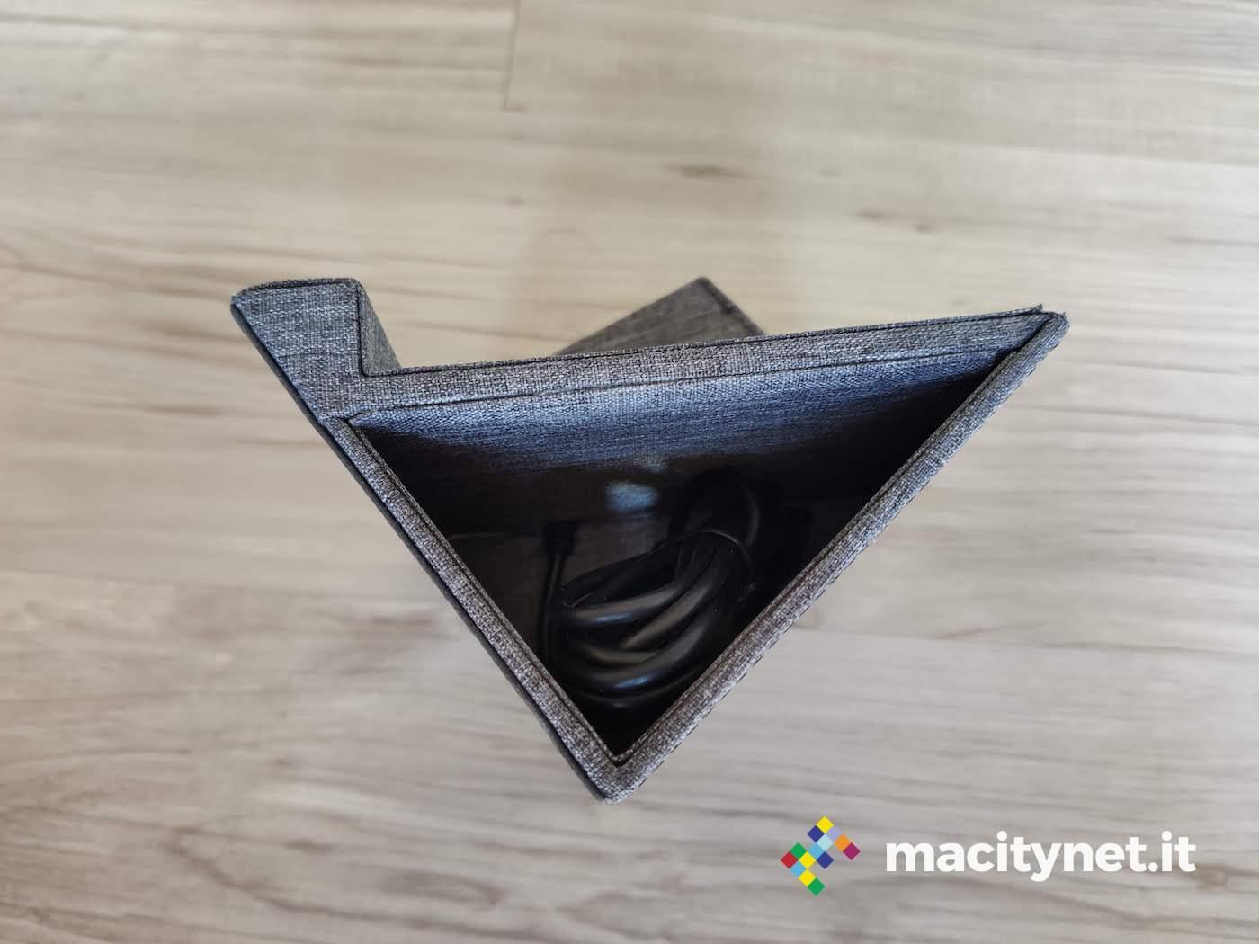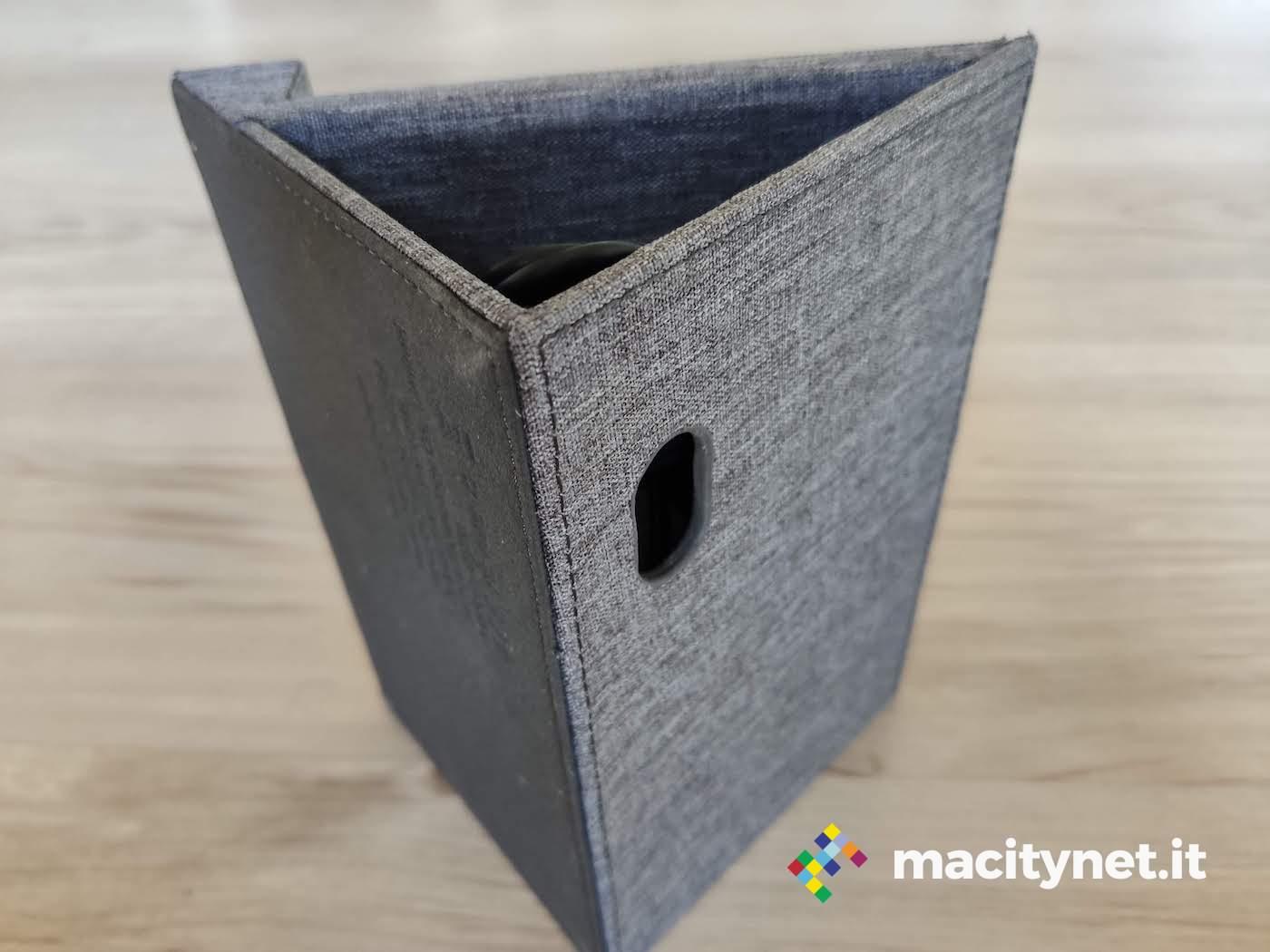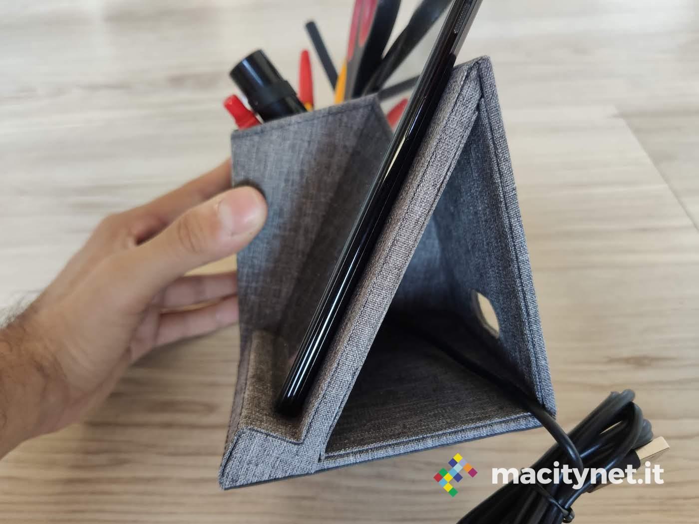 A livello estetico il prodotto si presenta bene. E’ interamente rivestito da tessuto grigio, dall’aspetto minimale, certamente adatto più ad uno studio moderno, che non ad una scrivania antica di legno. E’ composto da un unico pezzo, ma concettualmente si divide in due: da un lato il porta penne, dall’altro il supporto per lo smartphone da ricaricare.