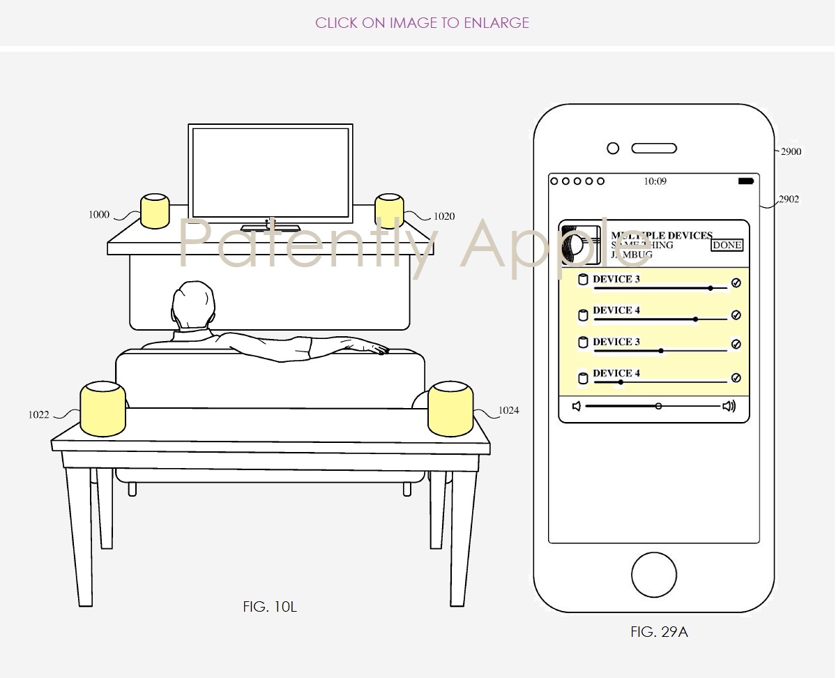 Il sito PatentlyApple ha individuato nel Regno Unito e in Danimarca una richiesta di brevetto di Apple dalla quale è possibile ipotizzare possibili future funzionalità e caratteristiche di HomePod. Una di queste è la possibilità di impostare un setup con quattro speaker rilevando automaticamente la propria posizione nella stanza e bilanciando il suono in base a dove sono disposti gli altoparlanti, funzionalità utile nell’ambito dell’home theater: una notizia che non sorprende considerando che Apple da tempo è al lavoro per entrare in questo settore.