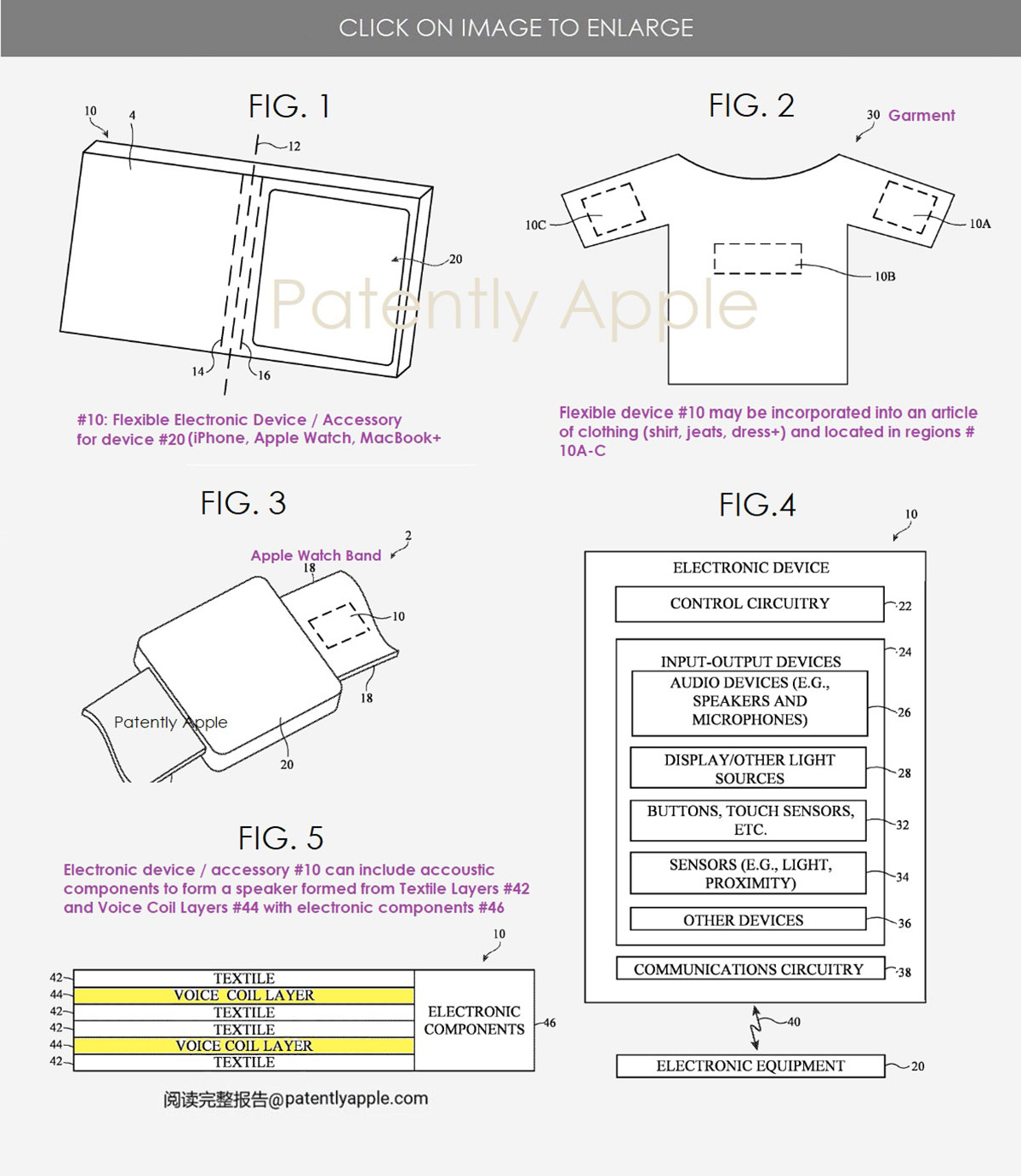 Dal Patent and Trademark Office statunitense si apprende l’esistenza di un brevetto di Apple che fa riferimento a possibili futuri accessori e articoli di abbigliamento con inclusi strati di tessuto acusticamente permeabile e bobine che formato la base di altoparlanti in tessuto.